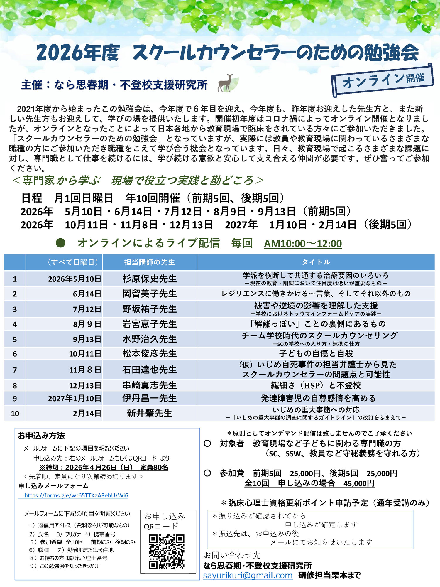 本研究所は、そうした教育現場で頑張っておられるスクールカウンセラーの先 生方や、資格や職業を超えてともに学びたいという近接領域の先生方と一緒に学 びの機会を持ちたいと、奈良にゆかりのある先生方にアドバイザーとなっていた だき開設しました。折からのコロナ禍もあり、オンラインでの勉強会を始めて、 今年で3年目に入っています。ここまで手作りの企画・運営が続けられましたの も、ひとえにご参加いただいている先生方のご協力のおかげと、こころより感謝 いたしております。
